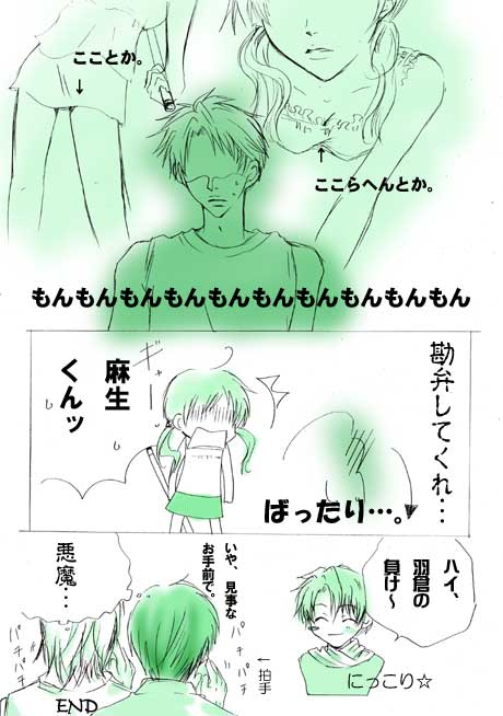 ------------------ 簡単に先の読める展開ですみませ…。 麻生のバカで可愛くてみんなに可愛がられてるところが 描きたかったんです…。 しかし…私の画力ではここまでしか顎がとがりませんでした。 要修行だね、本当…。 BACK?