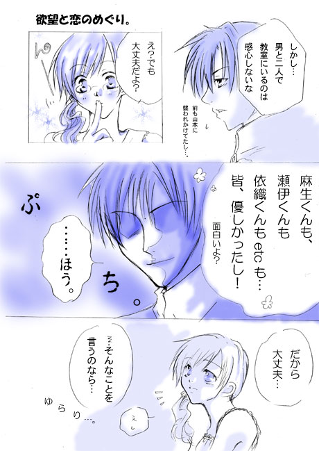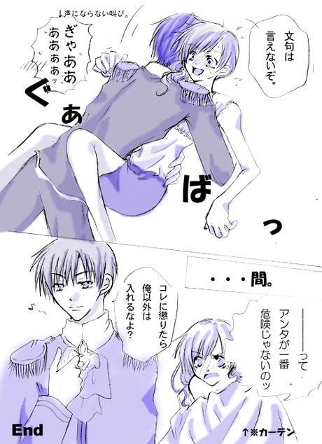 NEXT? BACK? -------------------------------- jealousyの続き漫画。 タイトルは某少女漫画のタイトルから(笑) 塗り方いつもと変えてみたんですが…どっちがいいかなぁ。 汚いのに変わりはないのがイタイところですが…。 カーテンがシーツ替わりなのは『魔女の条件』からデス(笑) BACK?